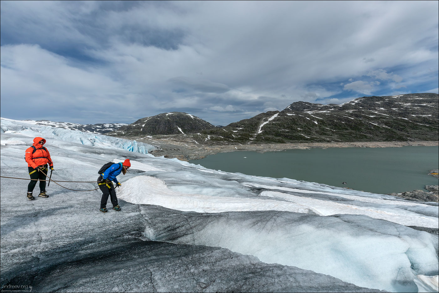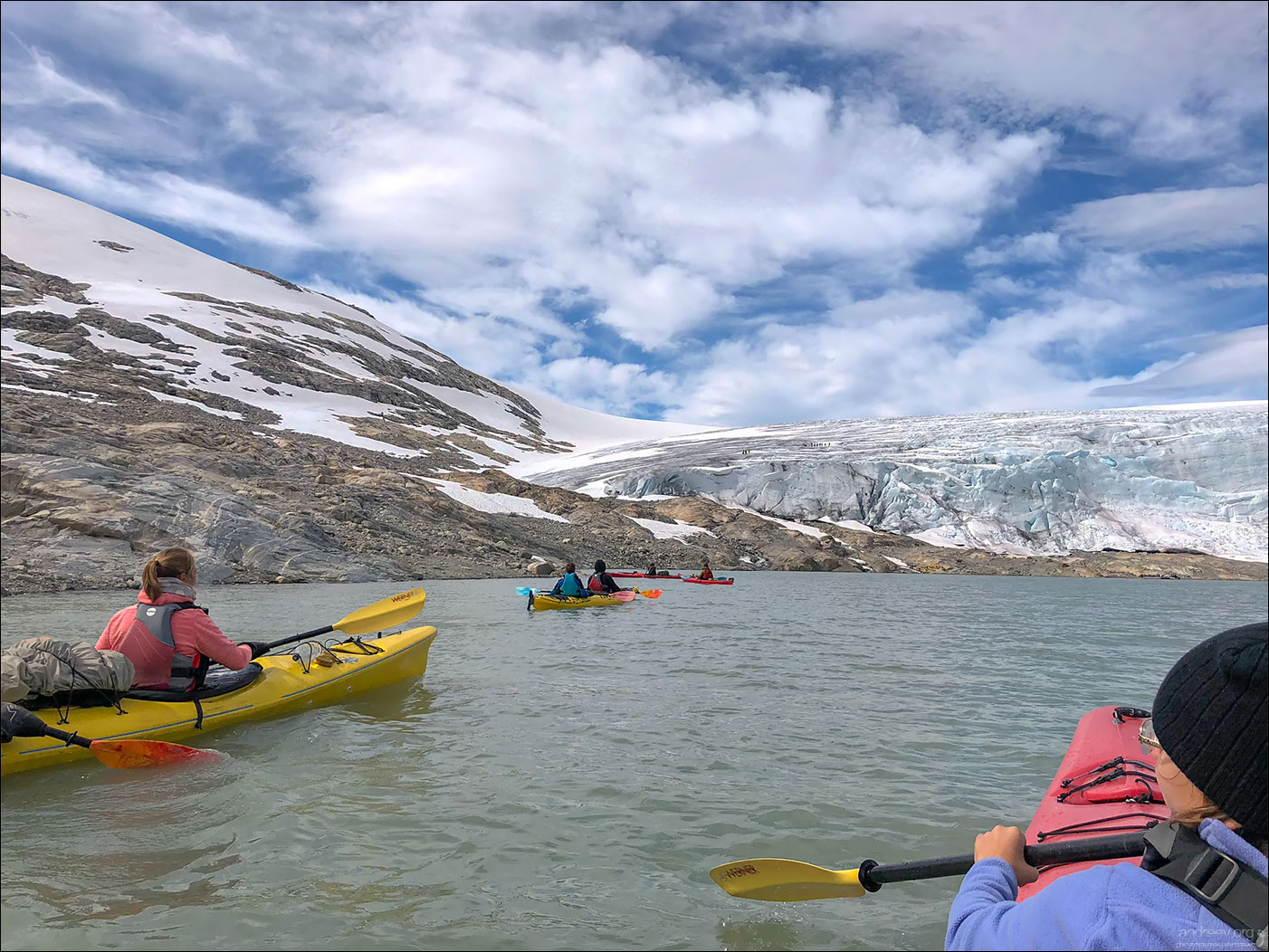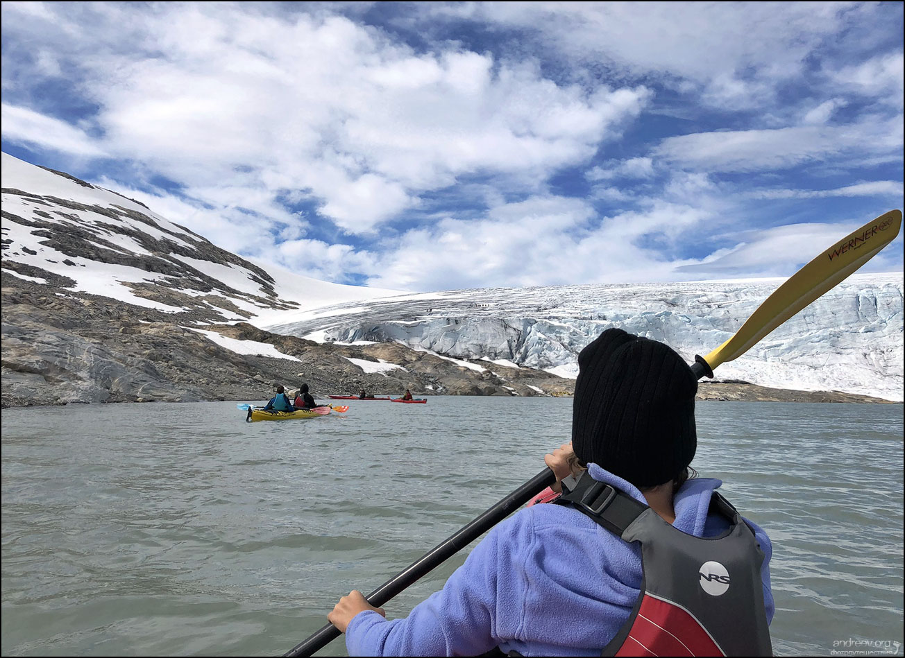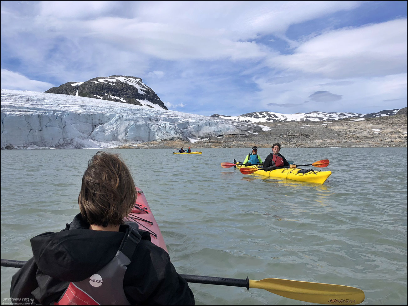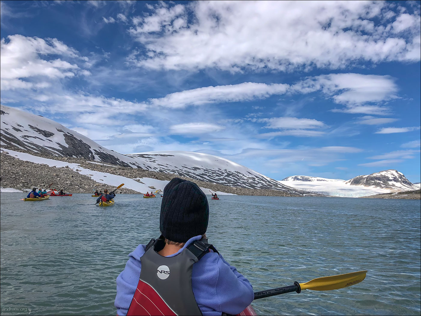 Фотографии из Национального парка Юстедалсбреен: каякинг по ледниковому озеру Styggevatnet с последующим подъёмом на ледник в “кошках”, бирюзовое озеро Lovatnet, и цветочный оазис в деревне Solvorn.