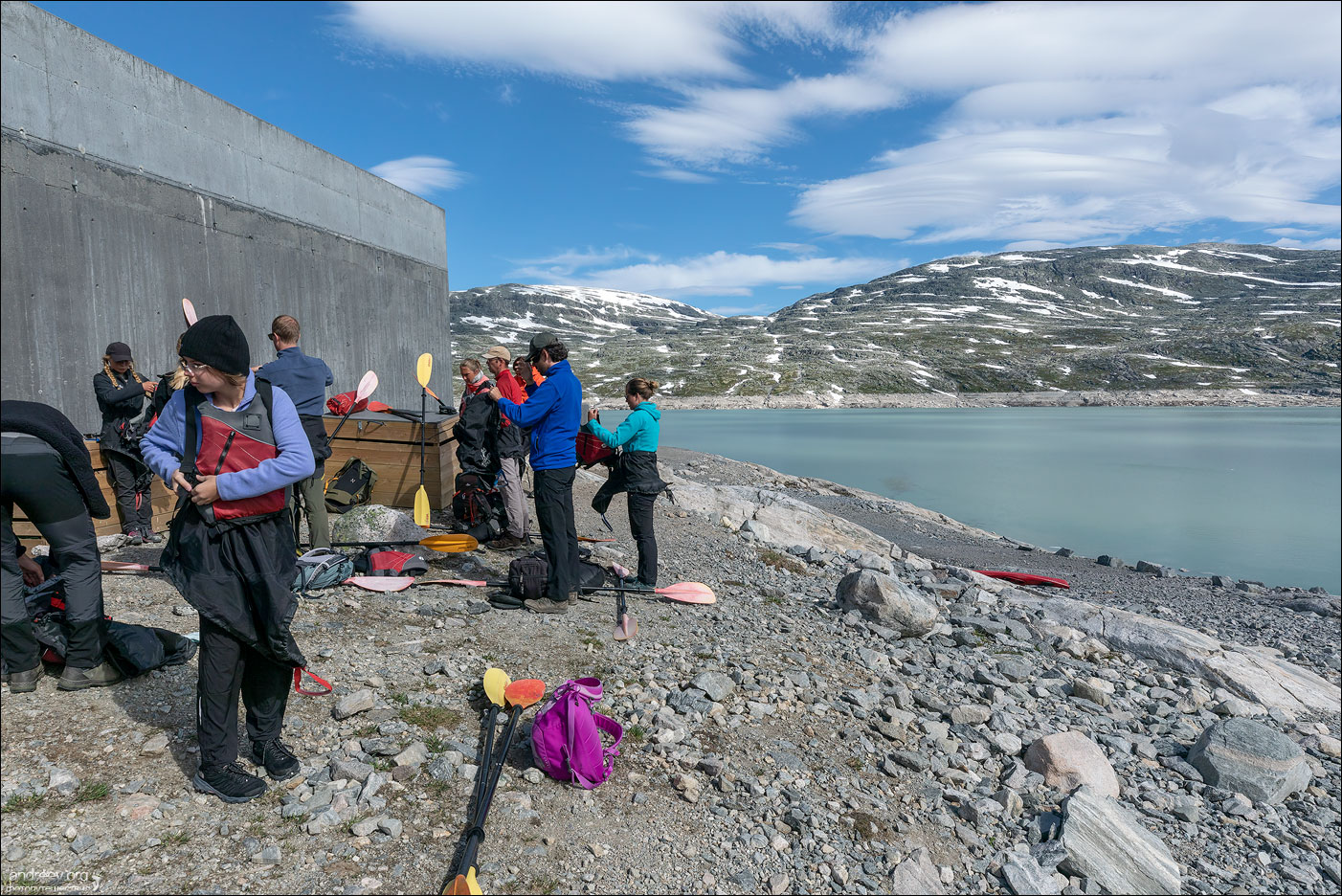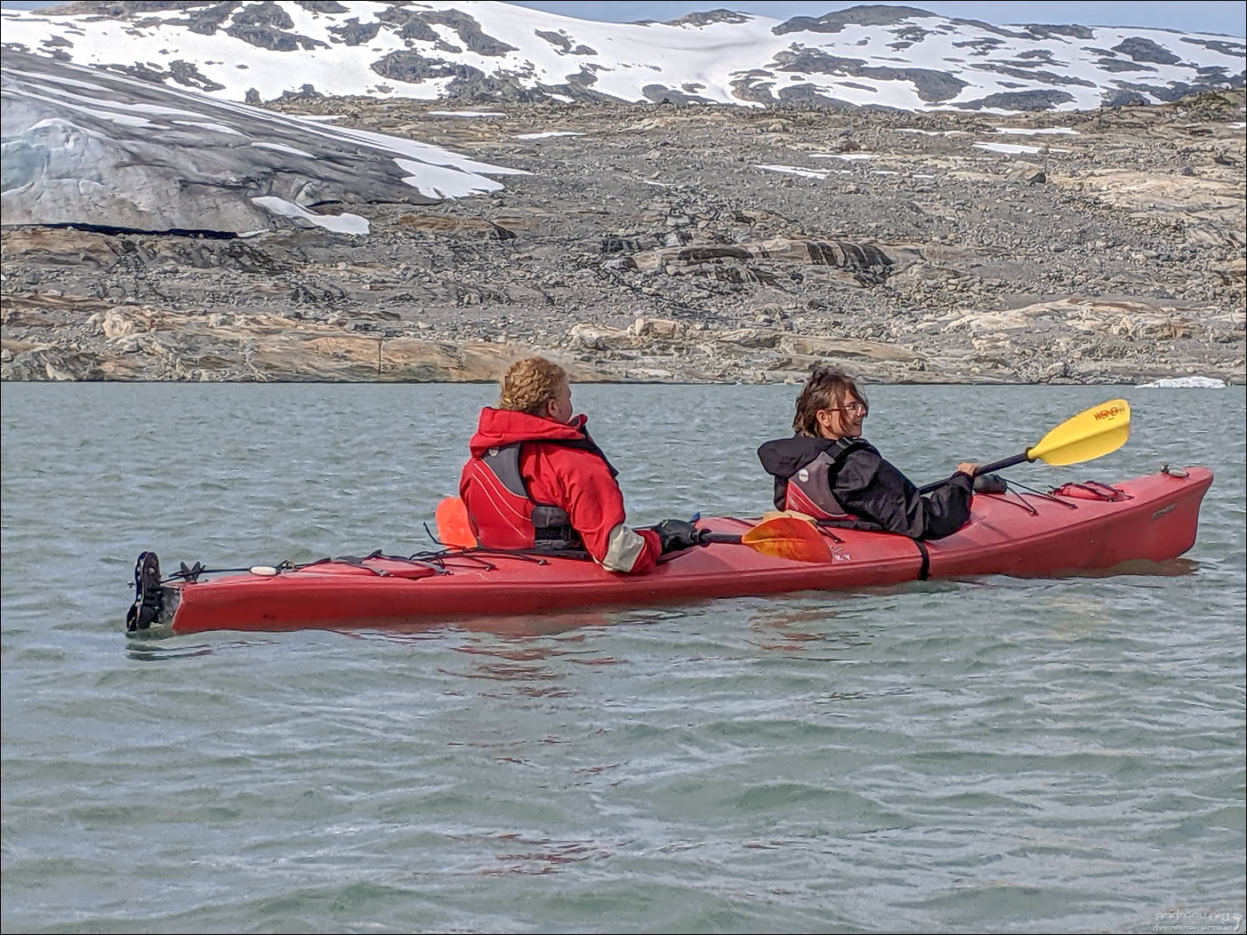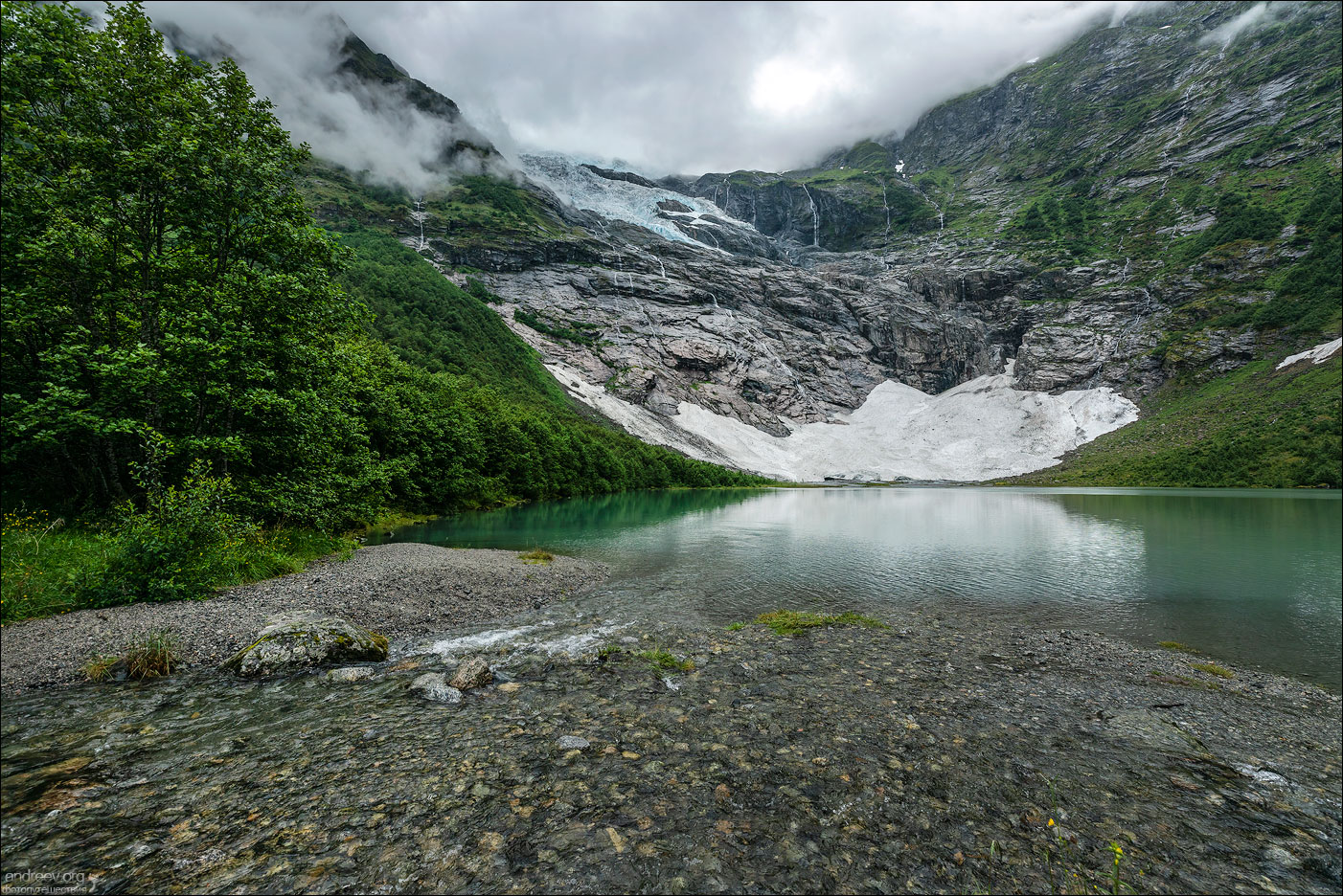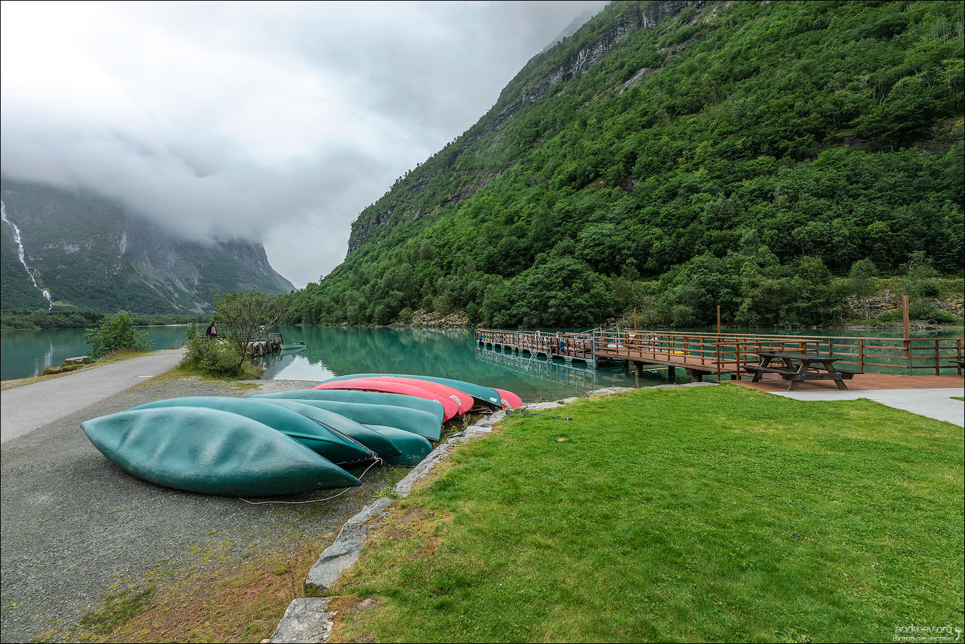 Фотографии из Национального парка Юстедалсбреен: каякинг по ледниковому озеру Styggevatnet с последующим подъёмом на ледник в “кошках”, бирюзовое озеро Lovatnet, и цветочный оазис в деревне Solvorn.