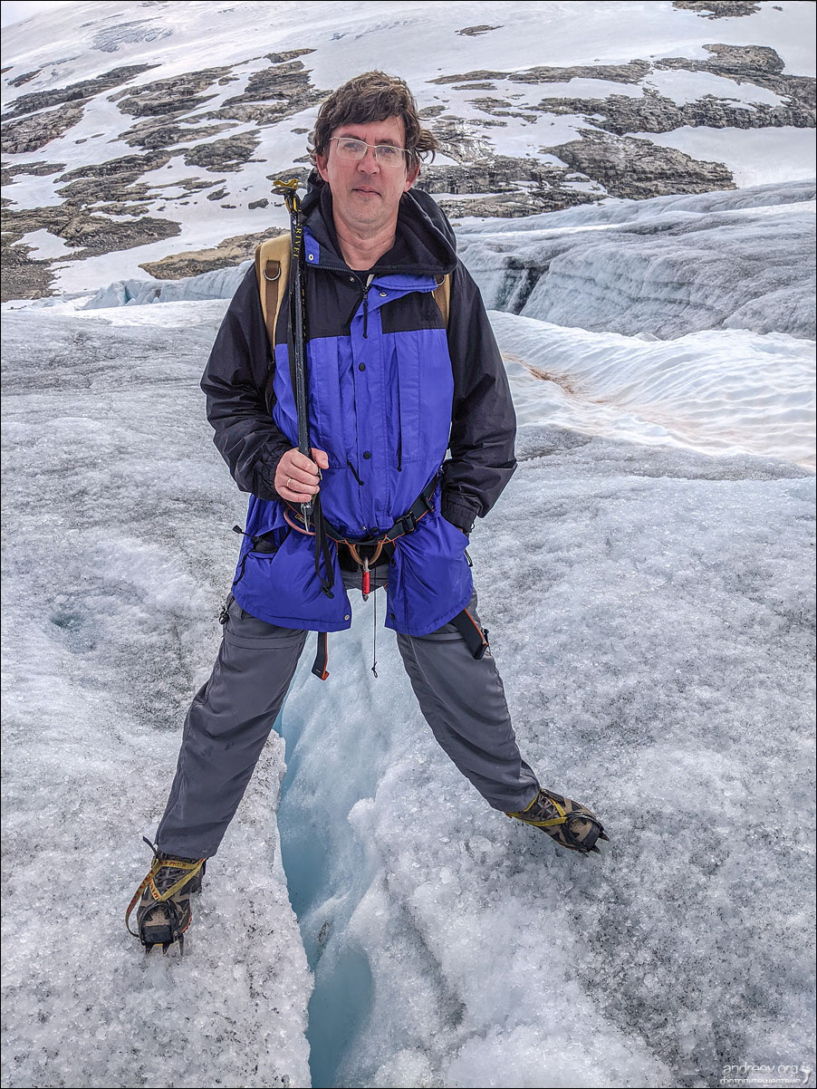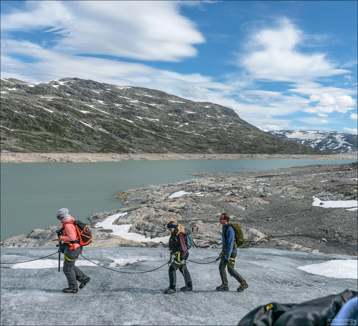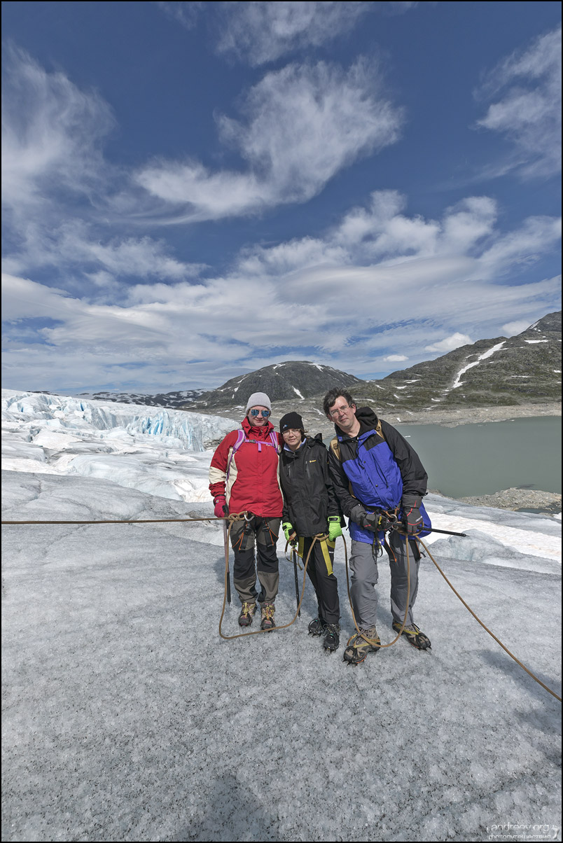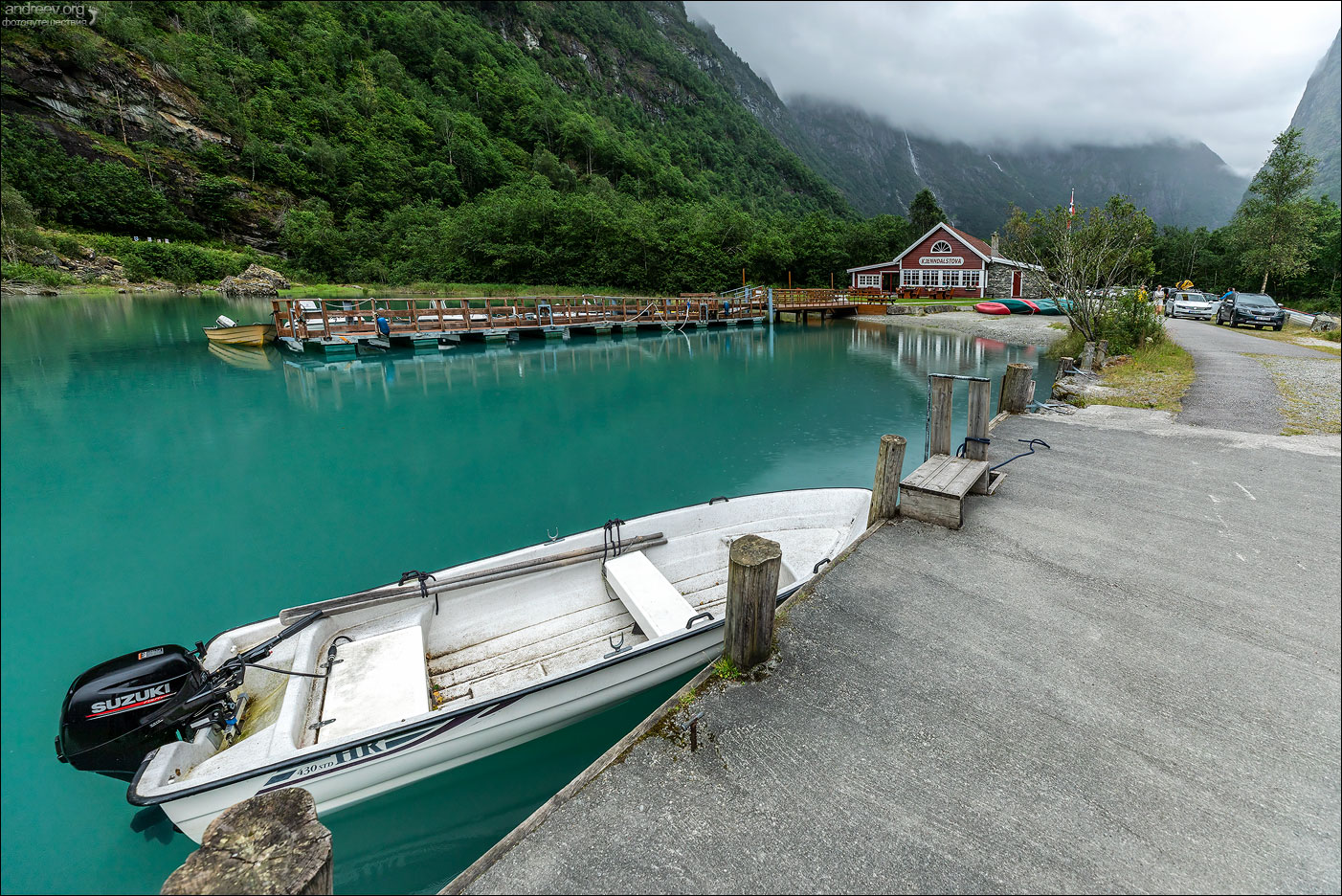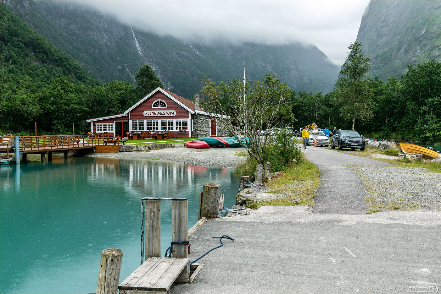 Фотографии из Национального парка Юстедалсбреен: каякинг по ледниковому озеру Styggevatnet с последующим подъёмом на ледник в “кошках”, бирюзовое озеро Lovatnet, и цветочный оазис в деревне Solvorn.