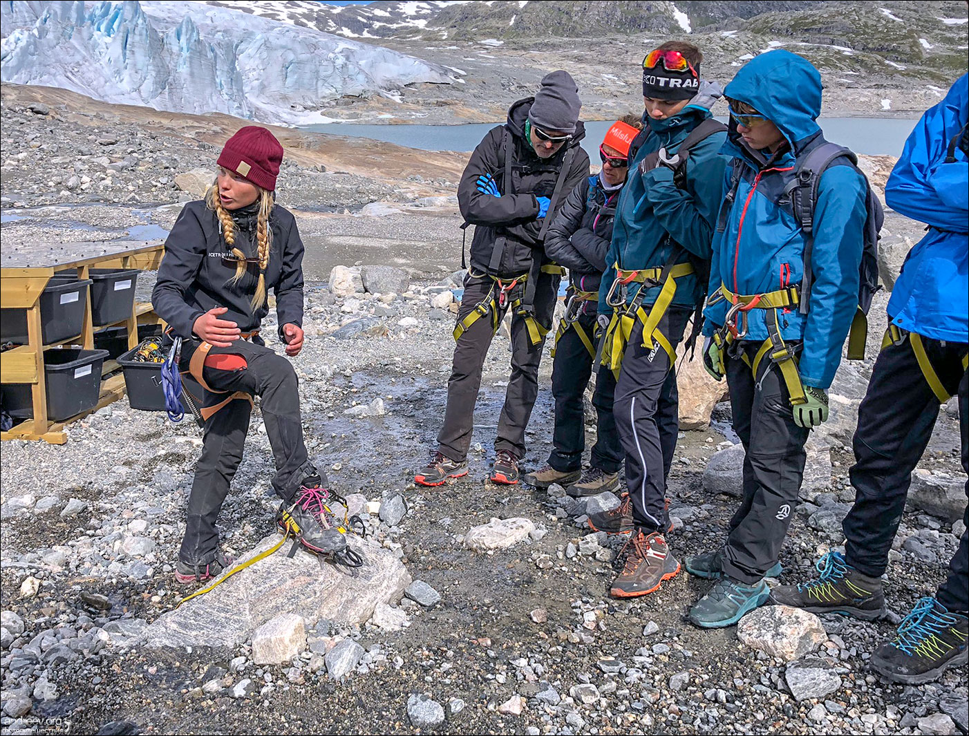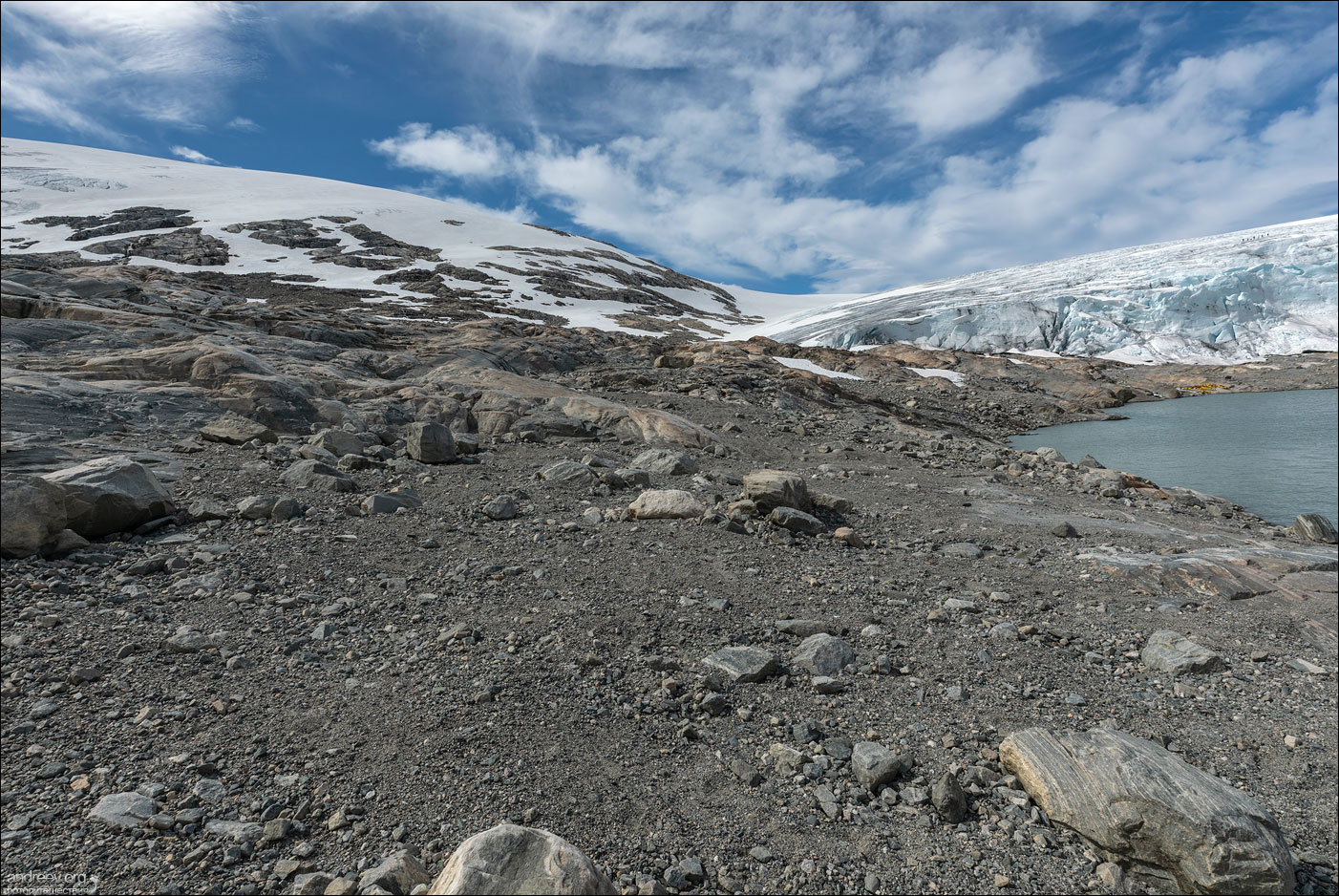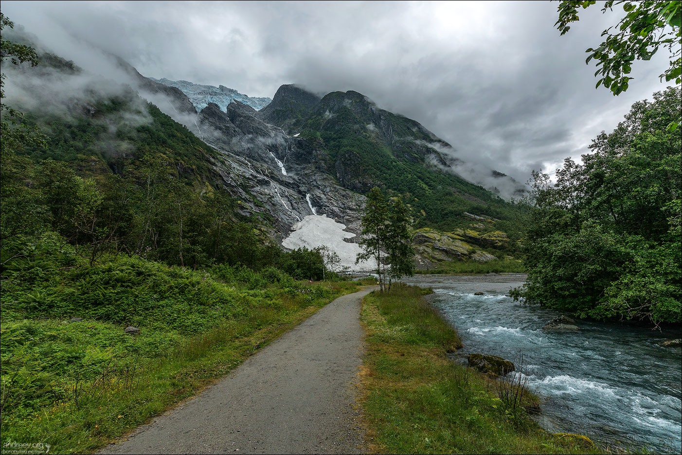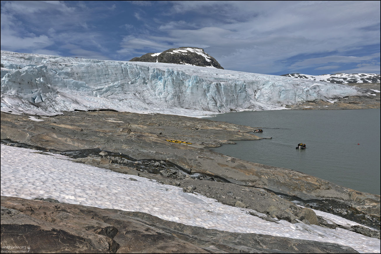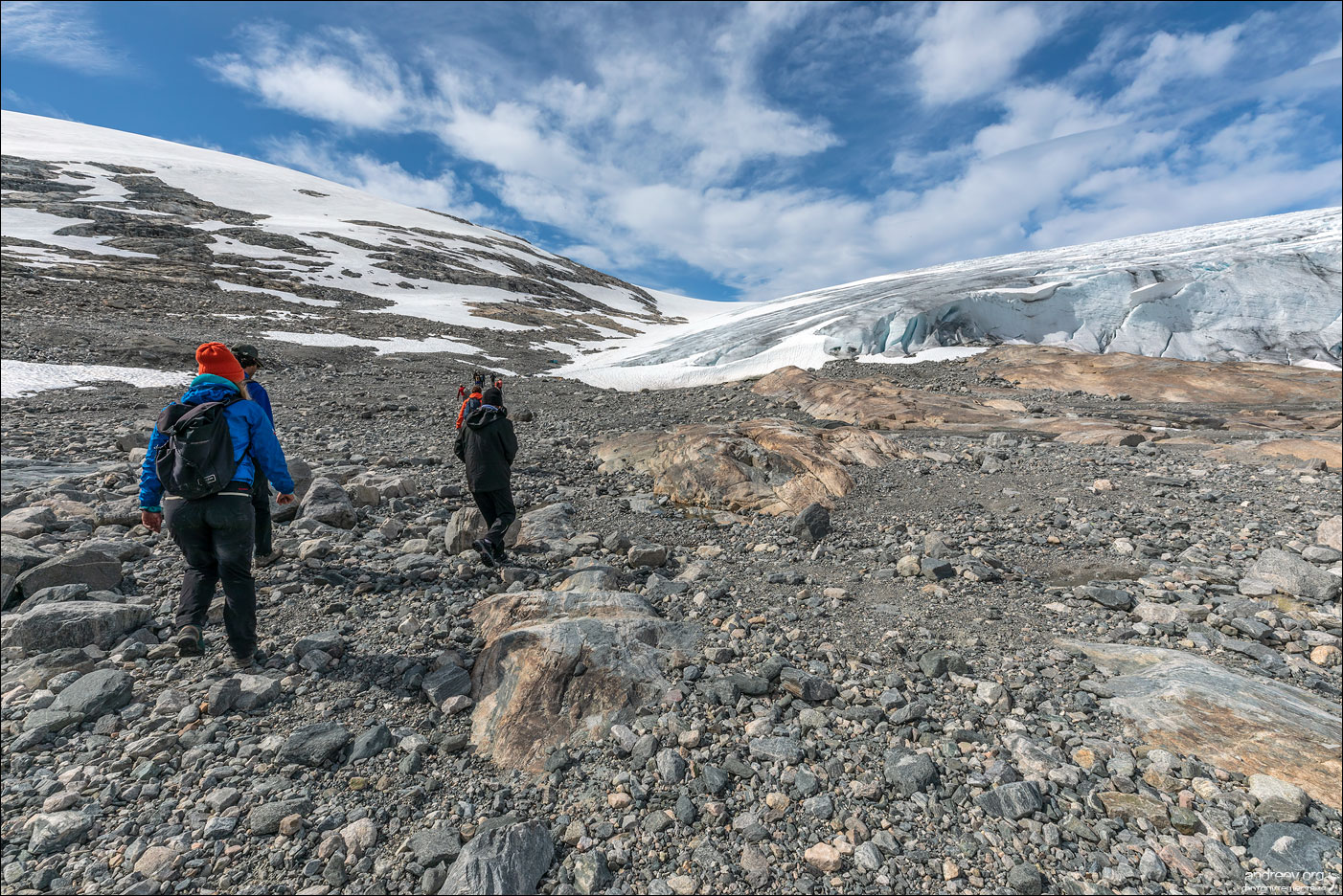 Фотографии из Национального парка Юстедалсбреен: каякинг по ледниковому озеру Styggevatnet с последующим подъёмом на ледник в “кошках”, бирюзовое озеро Lovatnet, и цветочный оазис в деревне Solvorn.