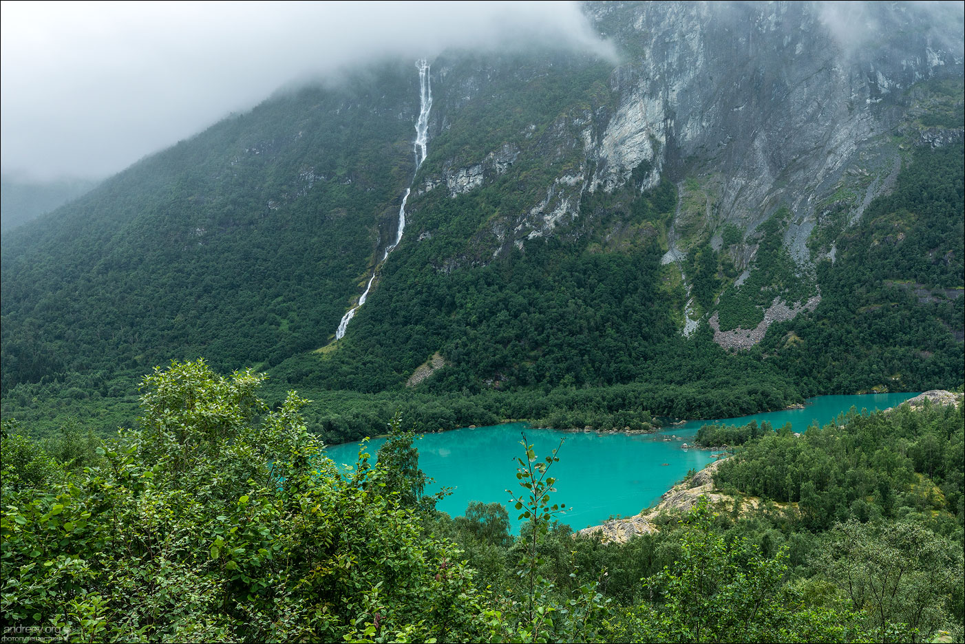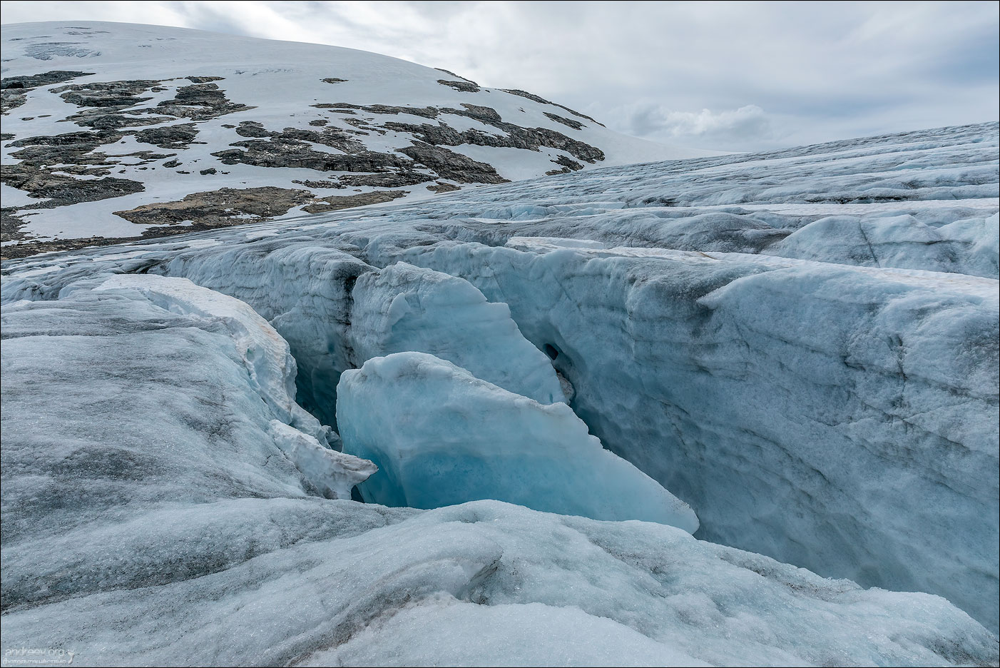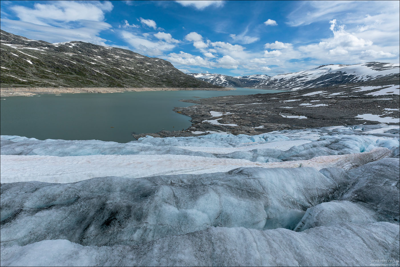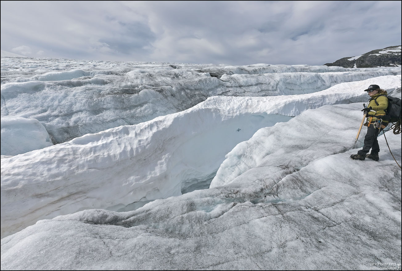 Фотографии из Национального парка Юстедалсбреен: каякинг по ледниковому озеру Styggevatnet с последующим подъёмом на ледник в “кошках”, бирюзовое озеро Lovatnet, и цветочный оазис в деревне Solvorn.