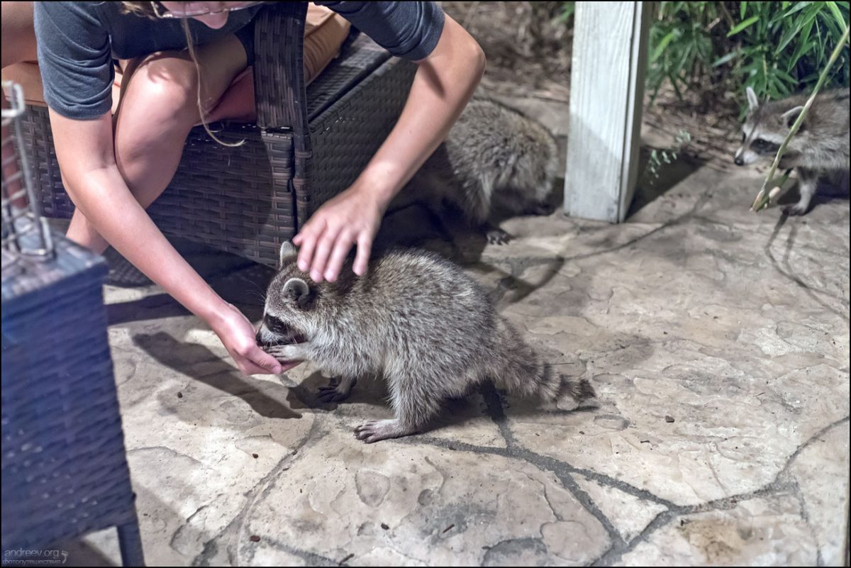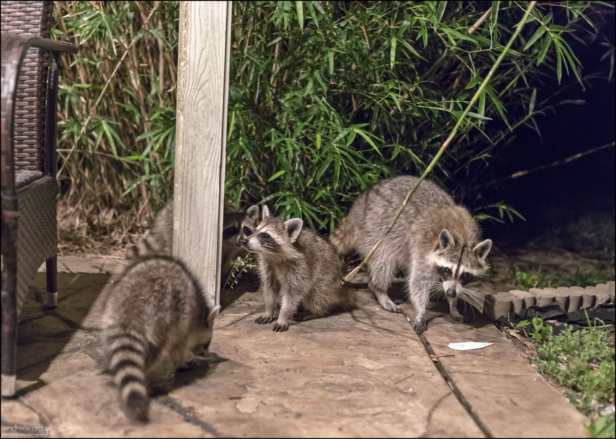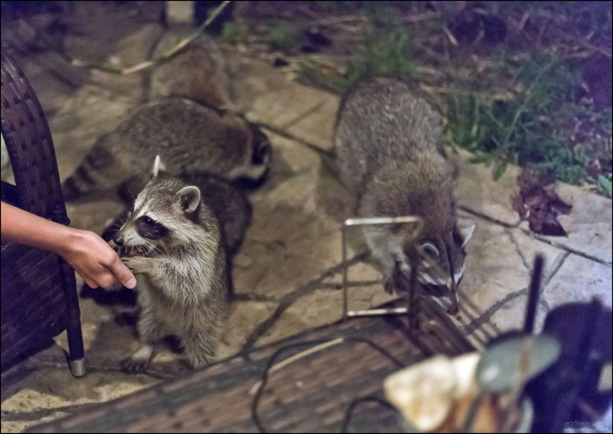 По нашим подсчетам, за вечер-ночь к дому приходит около 18 енотов: