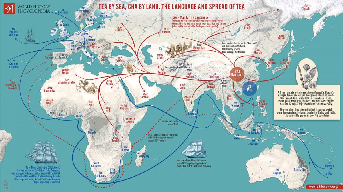 Напоследок, наглядное объяснение вечного вопроса, почему где-то говорят “tea”, а где-то “chai”: Tea by sea, cha by land (ти – по морю, чай – по земле) — это всё, что вам нужно знать о распространении чая по миру.