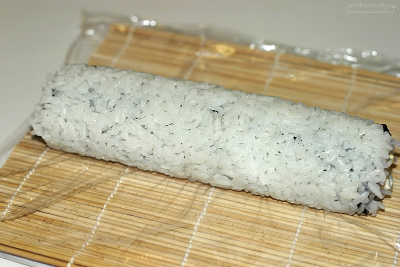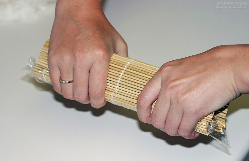 Попробую объяснить. Бамбуковый коврик состоит из реечек. Во время приготовления ролов представьте, что сделали оборот, уперлись концом коврика в водоросль. Теперь загибайте одну реечку наверх (отделять коврик от нори не нужно, просто такое движение – закатывание одной реечки на себя), и доворачивайте ролл вперед, чтобы конец коврика (уменьшенный на одну реечку) снова уперся в водоросль. Потом загибаете следующую реечку наверх, проворачивая ролл вперед, чтобы конец коврика опять соприкоснулся с водорослью, и т.д.