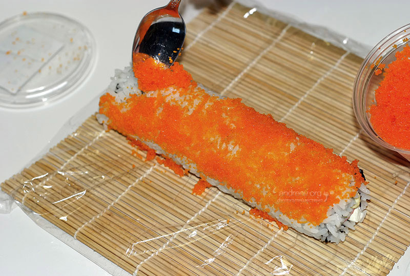 Полученную заготовку можно украсить снаружи, осторожно обсыпав семенами кунжута или мелкими икринками летучей рыбы, или тем и другим вместе.