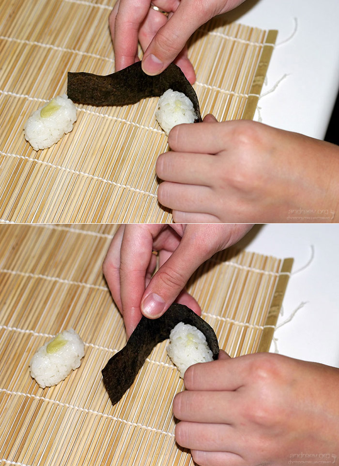 Возьмите лист водоросли нори, разрежьте его на полоски шириной 3 см, длинной 15 см (приблизительно). На каждый брусочек риса понадобится одна полоска. Вытрите руки, они должны быть сухими насколько возможно. Возьмите одну полоску нори, расположите её блестящей стороной наружу, и начинайте обматывать её вокруг рисовой заготовки, осторожно придавливая, как показано на фотографии.