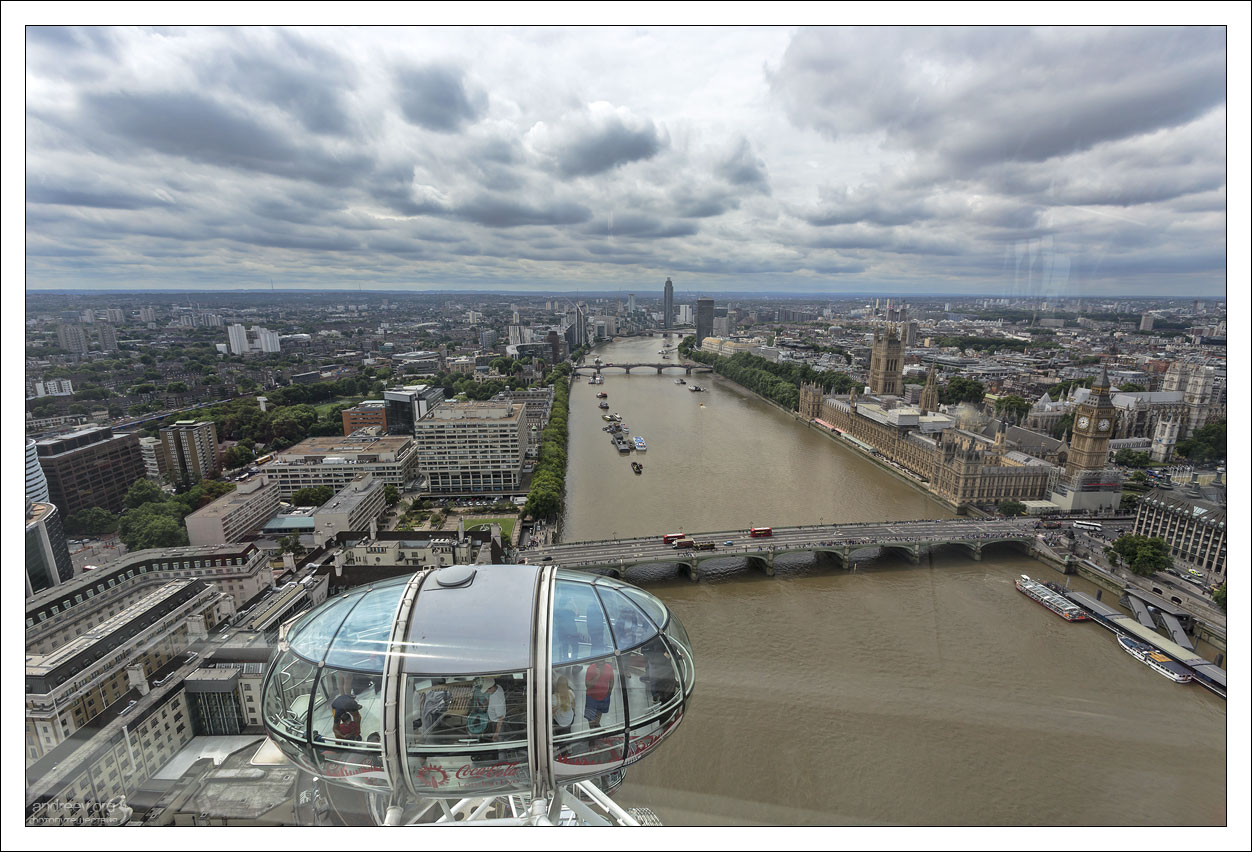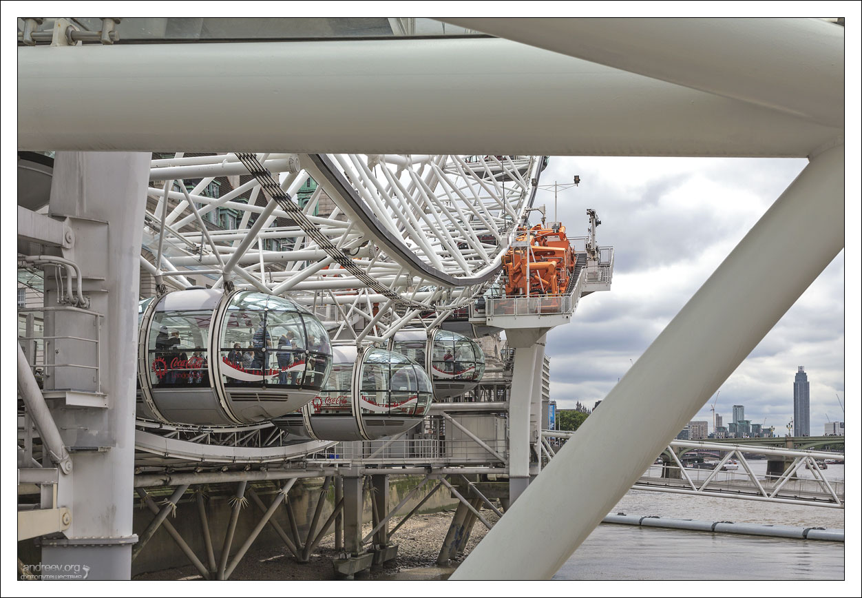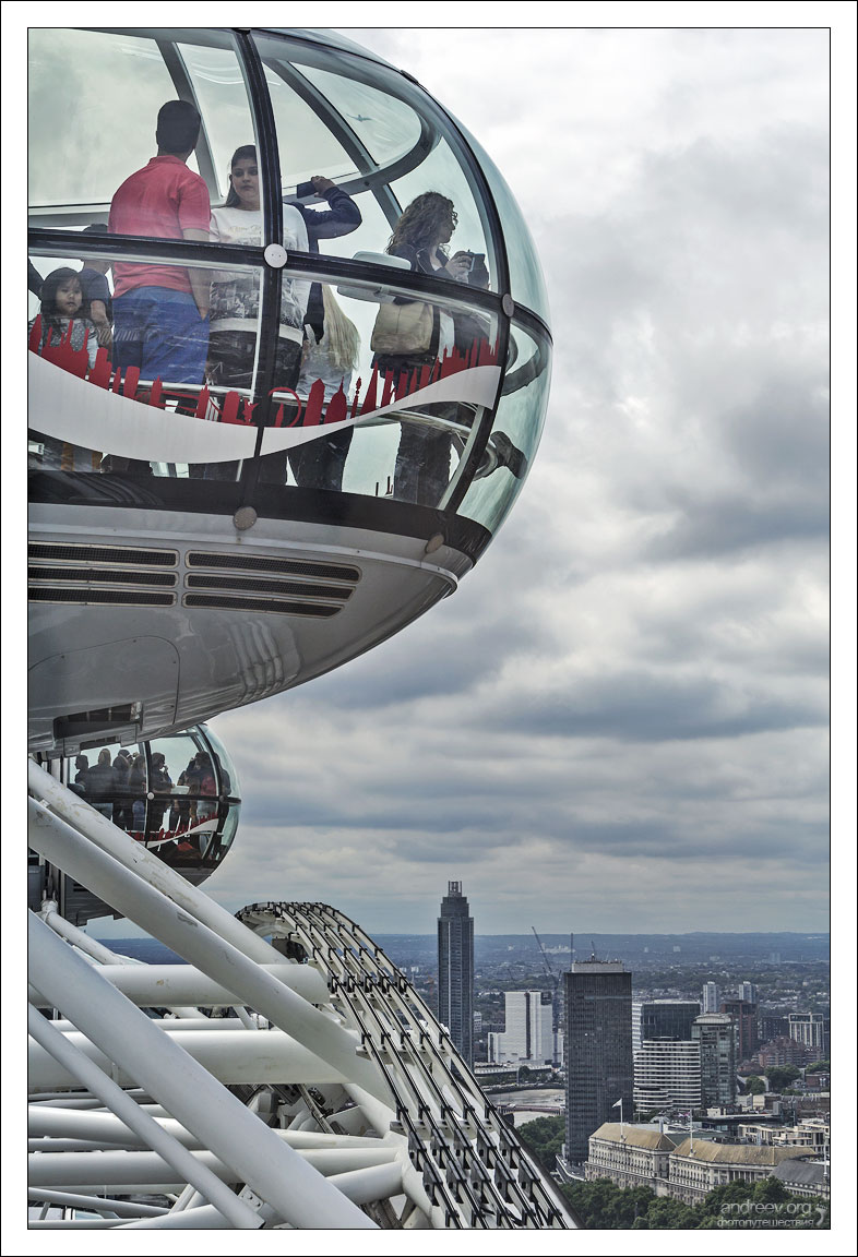 Колесо вращается с постоянной скоростью приблизительно 0,9 километра в час, а один полный оборот занимает 30 минут. Так что торопиться не надо, времени нащелкать Лондон с высоты хватает вполне.