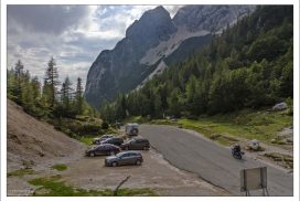 После поворота #8, отмеченного небольшим водопадом, расположена Русская часовня (машину удобно оставить чуть дальше, по правой стороне). Да и вся дорога до перевала Вршич известна здесь как “Ruska cesta” (“Русская дорога”). И часовня, и дорога построены русскими военнопленными во время Первой мировой войны.