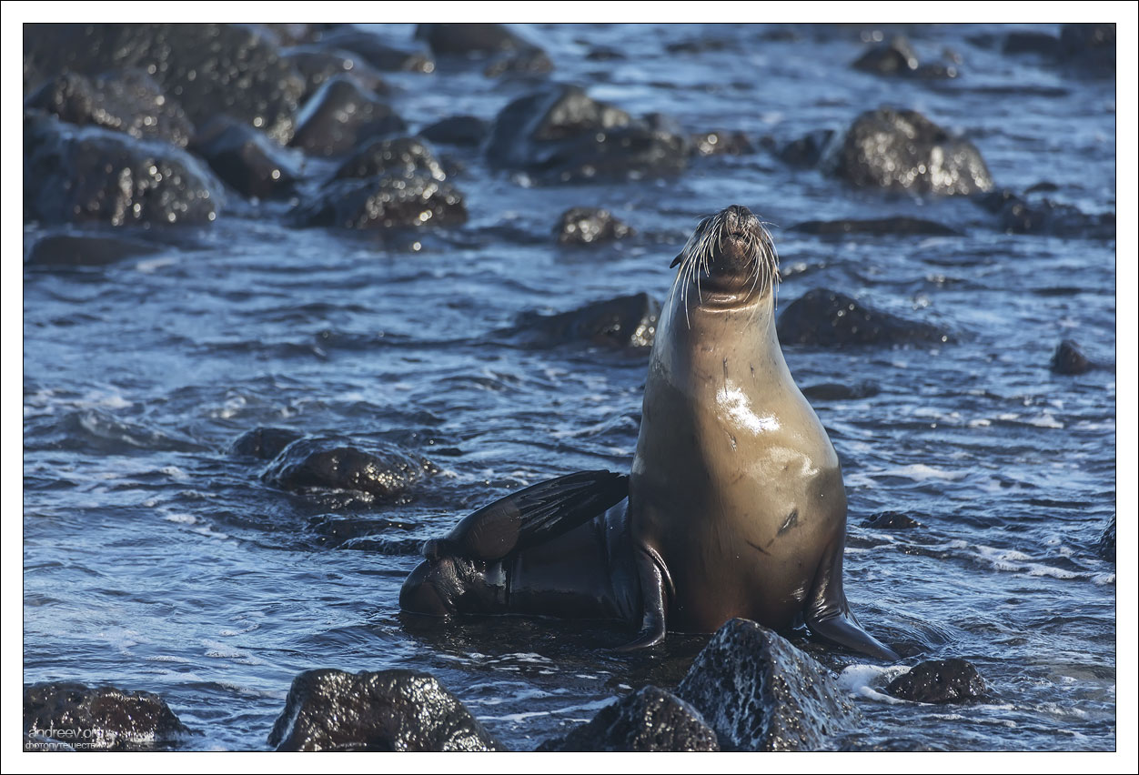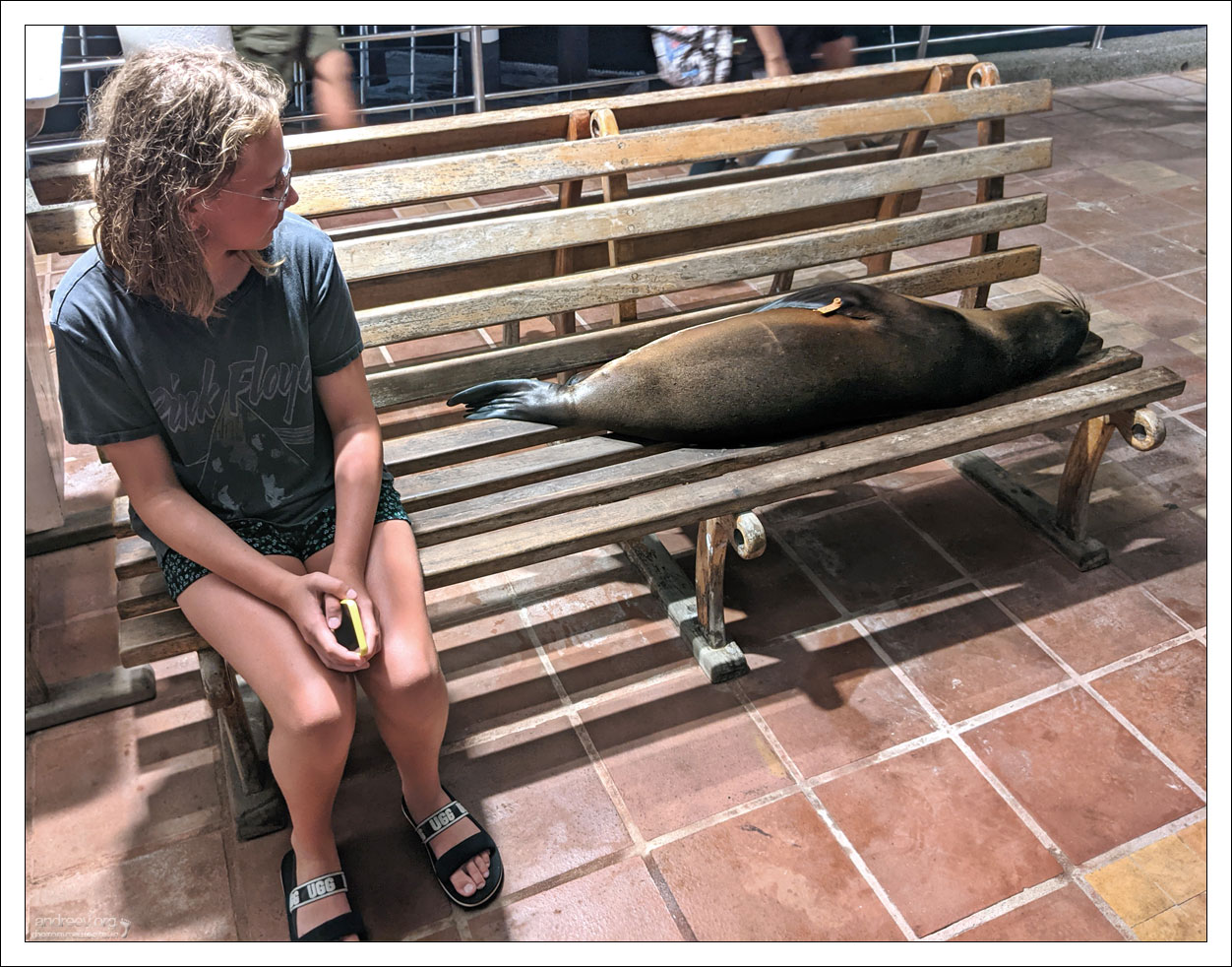 Морских львов на Галапагосах (Galapagos sea lion) около 50 тысяч, и их любят примерно все. Зачастую львы специально подплывают к купающимся людям, дергают за ласты, и щекочут усами. Днем любят валяться на набережных в фривольных позах, на скамейках в том числе. И хоть бы кто попробовал их согнать!