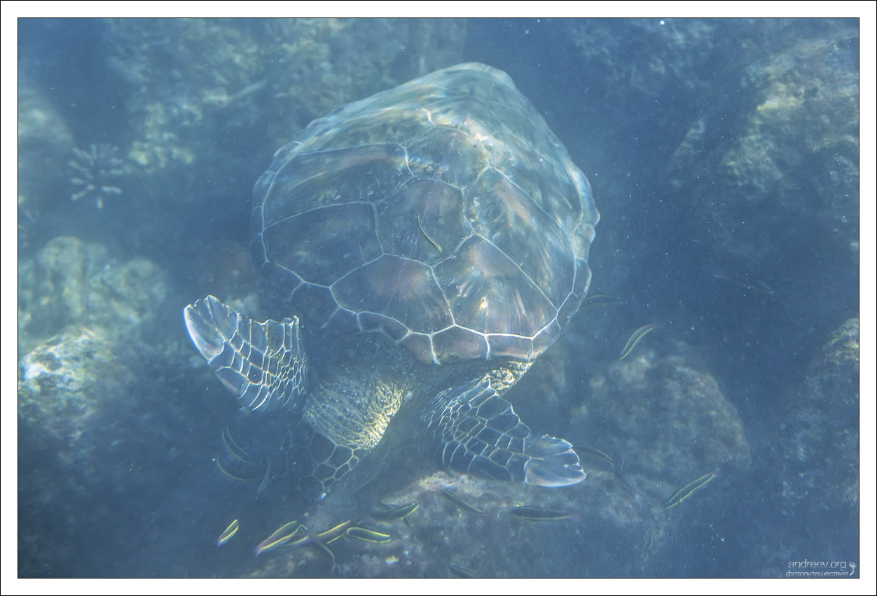 Да, и пара слов о морских черепахах – редко, когда купались, не видя их. Черепахи пасутся под водой у самого берега, не обращая никакого внимания на людей. Просят, конечно же, не трогать, но бывает, что черепахи сами задевают ластами или пихнут случайно боком зазевавшегося человека; радости полные штаны.