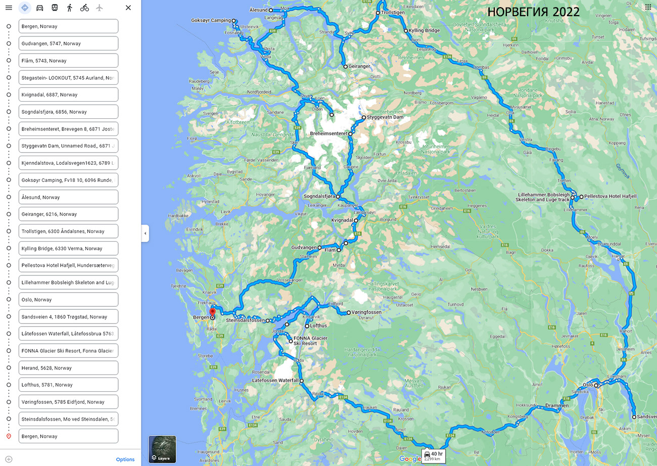Маршрут (~ 2400 км): Берген – круиз по фьорду Mofjorden – Voss (zip-line) – Gudvangen – Nærøyfjord (каякинг по фьорду) – Flam – Stegastein (обзорная площадка) – Aurlandsfjellet (Снежная дорога) – Breheimsenteret (центр ледников) – дамба и озеро Styggevatn (каякинг) – ледник Austdalsbreen (подъем в «кошках») – Solvorn (в гостях «у бабушки») – ледник Supphellebreen – ледник Boyabreen – озеро Lovatnet (форель) – остров Runde (съемка тупиков) – остров Jensholmen – Ålesund – Geiranger – Дорога Троллей – ж/д мост Kylling Bridge – Лиллехаммер (бобслейная трасса; прыжки на лыжах с трамплина) – Осло – лосиное сафари – ставкирка в Хеддале – водопад Låtefossen – Herand – горнолыжный курорт Fonna – Lofthus (яблочные сады) – водопад Vøringsfoss – по берегу фьорда Hardangerfjord – водопад Steinsdalsfossen – возвращение в Берген.