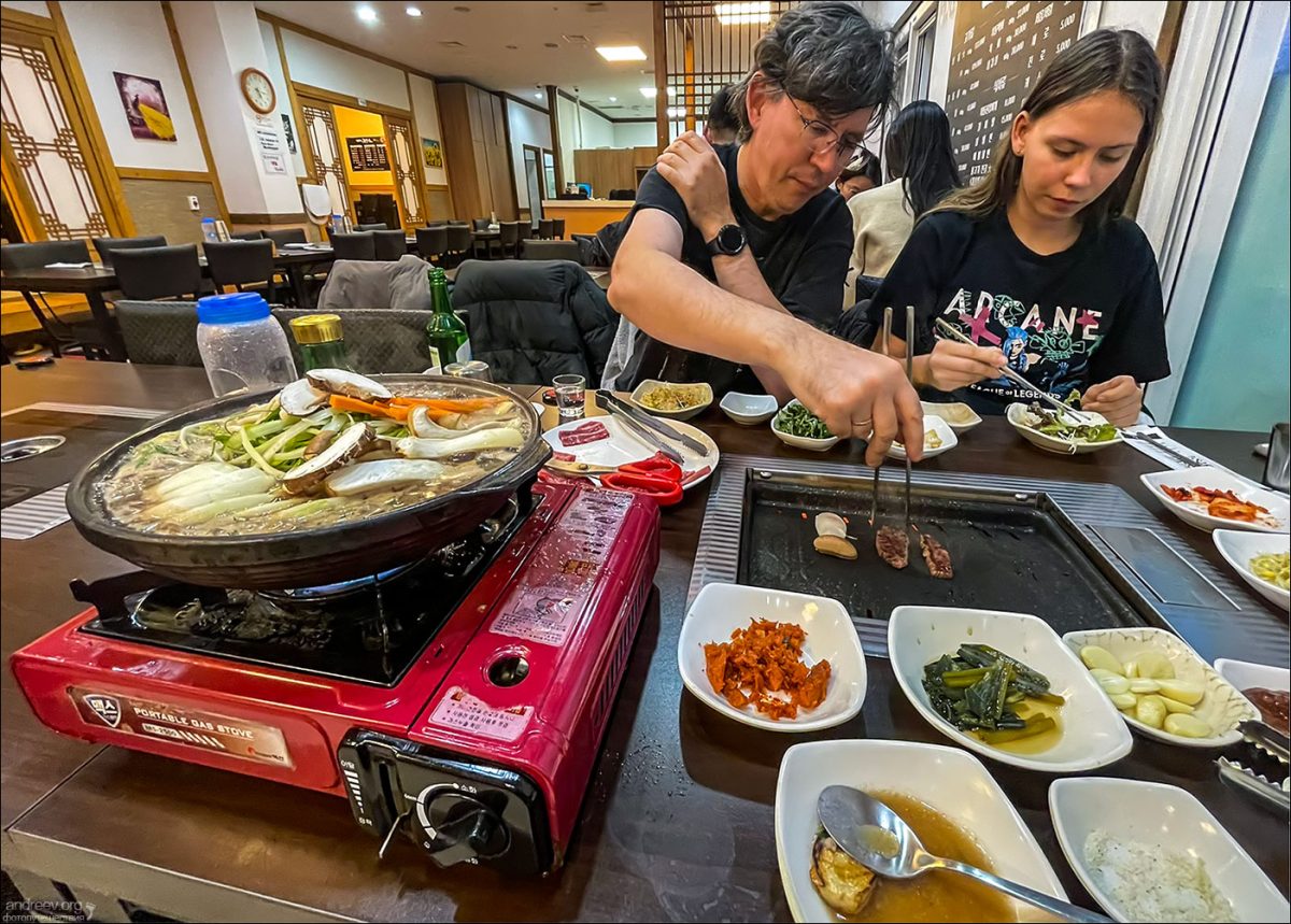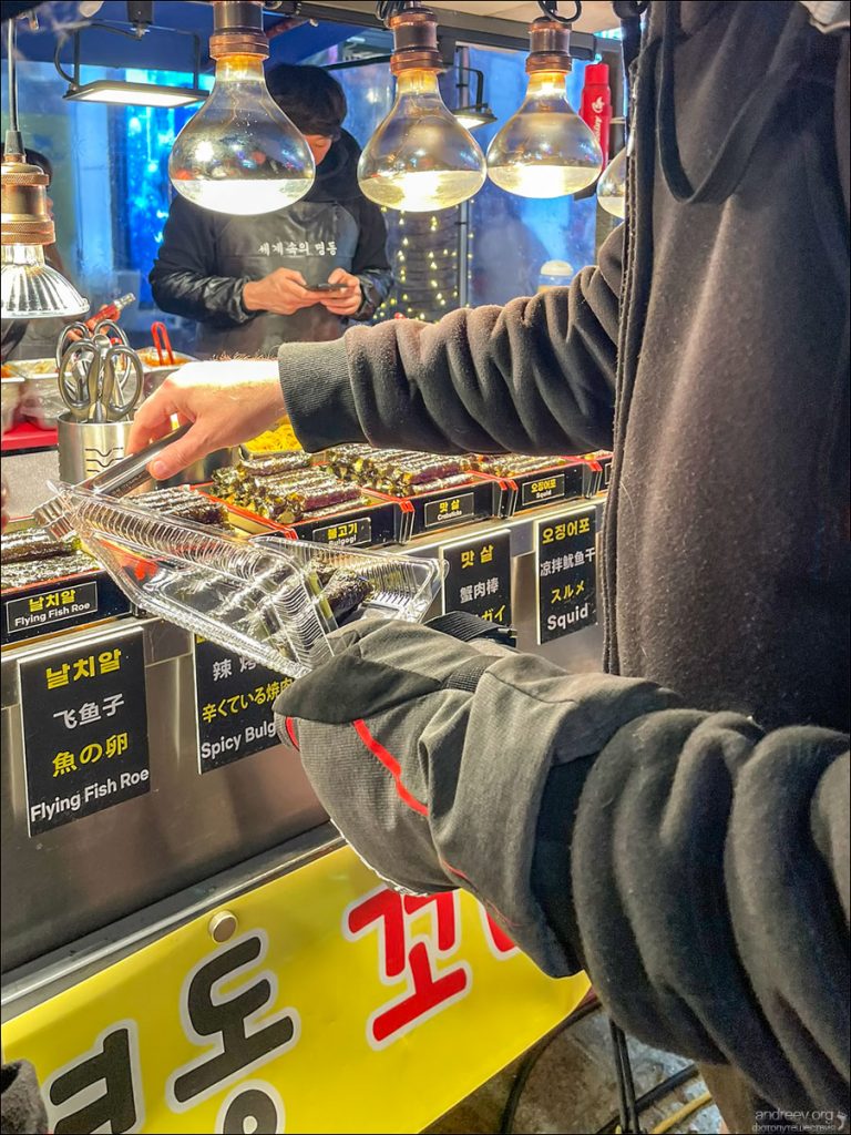 В интернете полно списков “10 best Korean food” или “25 most tasty Korean street snacks”. С чем-то мы согласны, с чем-то категорически нет. Характерный пример — Tteokbokki (Ттокпокки) — популярное корейское уличное блюдо, представляющее собой мягкие рисовые клёцки, тушенные в остром соусе. Расхваливается во всех путеводителях. На наш взгляд — гадость редкостная. Но всё же таких примеров мало. На деле понравилось очень и очень многое, а непривычные сочетания вкусов и специй хорошо натренировали вкусовые рецепторы.