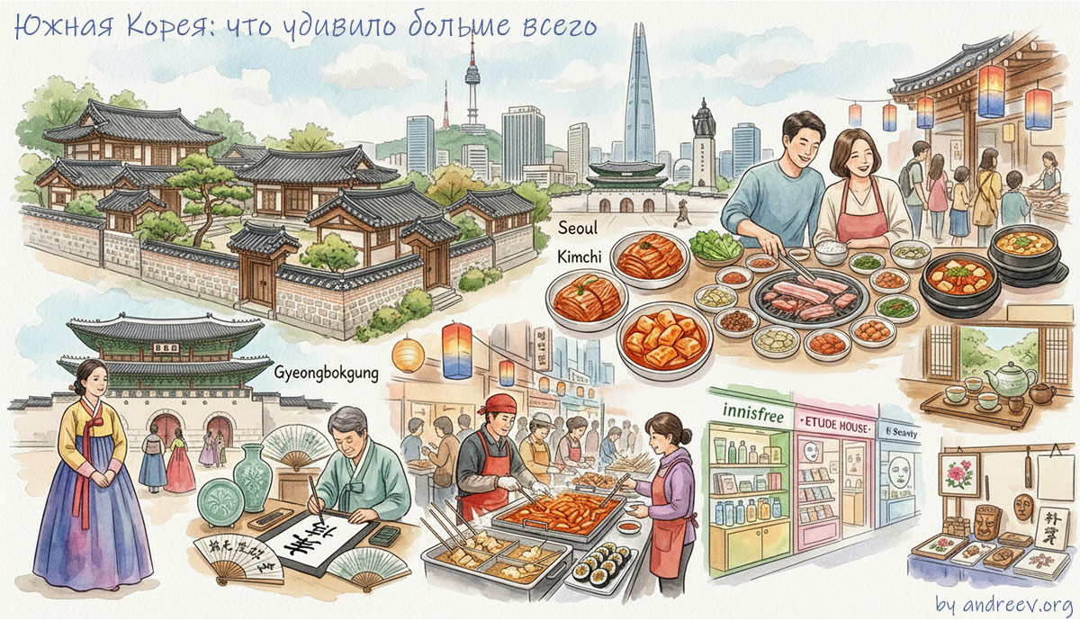 Южная Корея оставляет после себя цельное, но неоднозначное впечатление: страна, где древние традиции уживаются с гипертехнологичным настоящим, где язык кажется логичным, но непривычным, культ внешности — почти нормой, еда — отдельной вселенной, а вождение — испытанием на терпение. Это путешествие не про «идеально», а про контрасты: про моменты, которые искренне восхищают, и детали, к которым нужно привыкнуть.