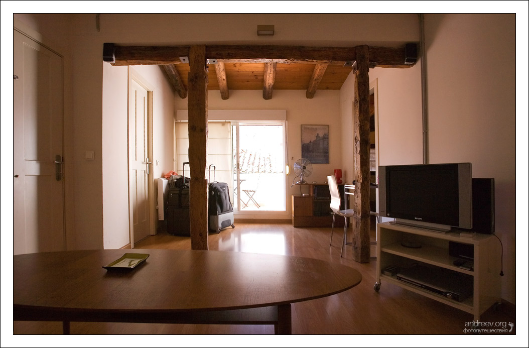 Хозяин съемной квартиры встретил перед подъездом (там дополнительный замок), не погнушался сходить с мужем в гараж за чемоданами (мелочь, а приятно), и показал апартамент на 4-м этаже (есть лифт). В квартире было две комнаты – спальня и гостиная, сбоку примыкала вполне вместительная кухня, а окна выходили на террасу, где вечером хорошо было сидеть дегустировать вино, и смотреть на прохожих.