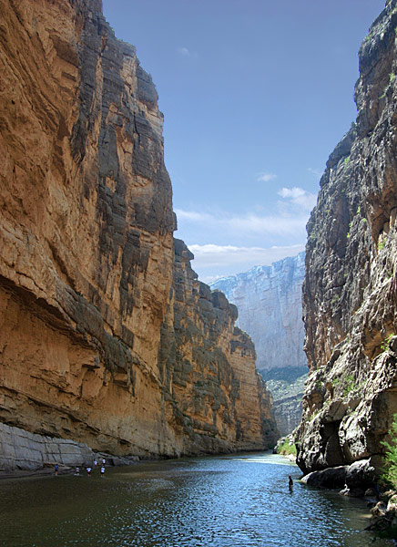 Немного не доходя до конца тропы (упирается в скалу у воды), мы развалились на огромном плато прямо над берегом Рио Гранде. Каньон в этом месте довольно узкий, перейти на другую сторону ничего не стоит. За процессом “побега в Мексику” мы и наблюдали. Группа американских тинэйджеров с радостными воплями и по пояс в воде скакала неподалеку. Добежав до мексиканской стороны, они побарахтались там, маша руками своему товарищу, оставшемуся на американском берегу. Но т.к. дальше хода не было (гладкая поверхность скалы, уходящая на много десятков метров вверх), то пришлось народу возвращаться в родные пенаты 🙂