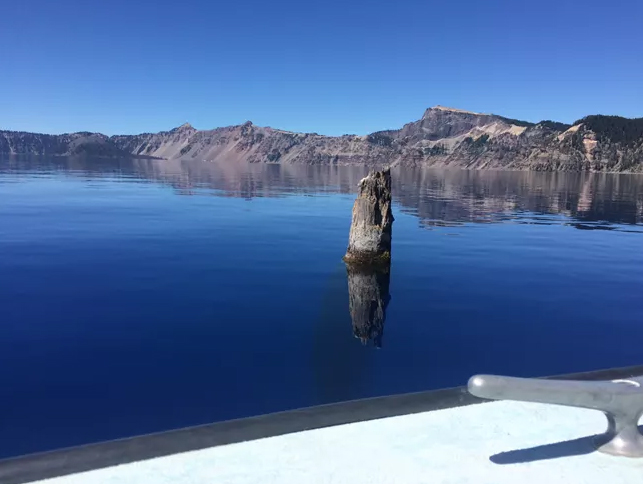 Это девятиметровый пень горной тсуги, который уже больше 120 лет плавает по озеру… в вертикальном положении. Его впервые заметили в 1896 году. Радиоуглеродный анализ показал, что возраст дерева превышает 450 лет.