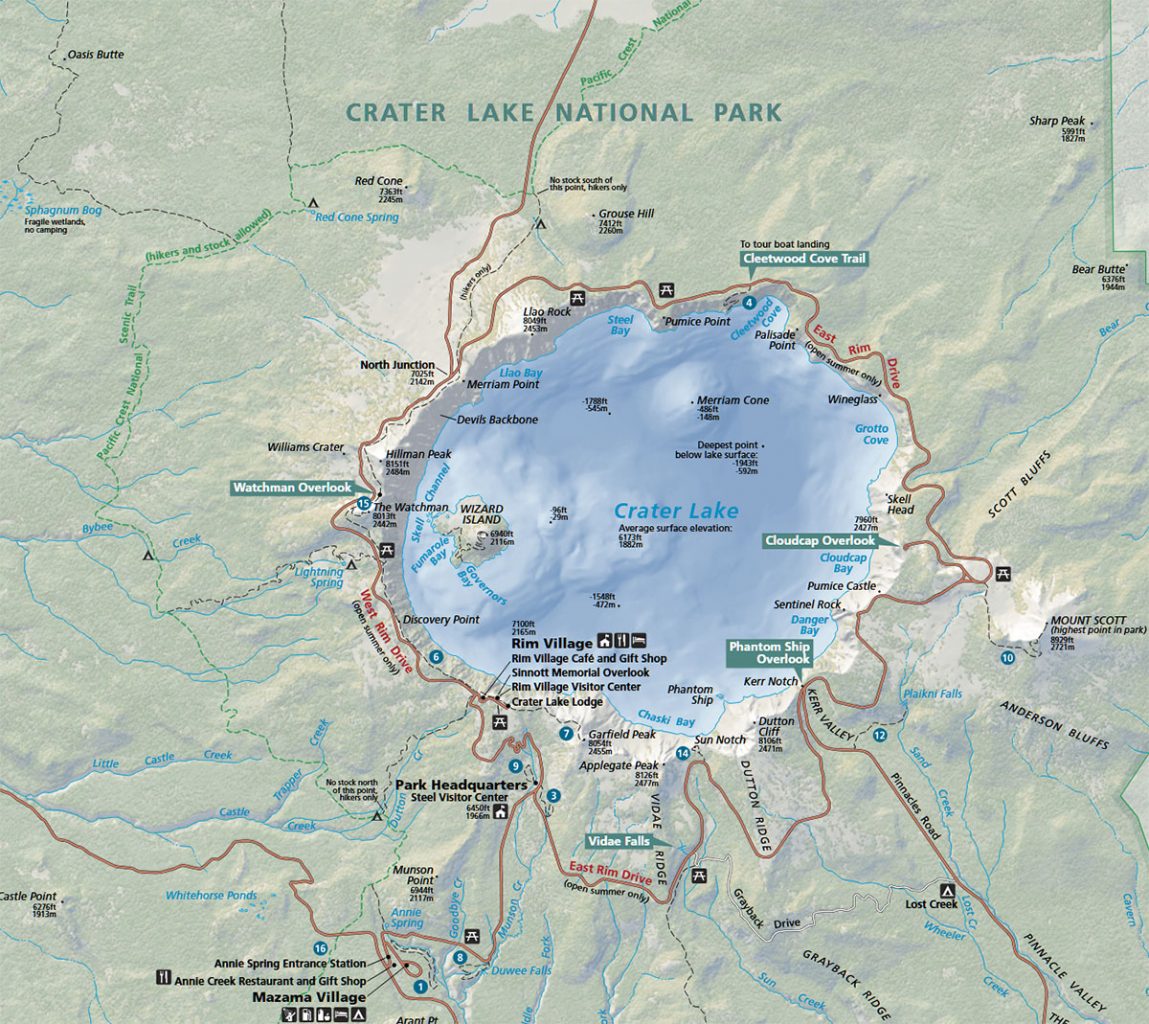 Почти весь парк Crater Lake можно объехать по одной дороге. Она называется Rim Drive и идёт по самому краю кальдеры, повторяя контур гигантской вулканической чаши. Делится на два участка: West Rim Drive (Западная часть) и East Rim Drive (Восточная). См. карту, кликабельно: