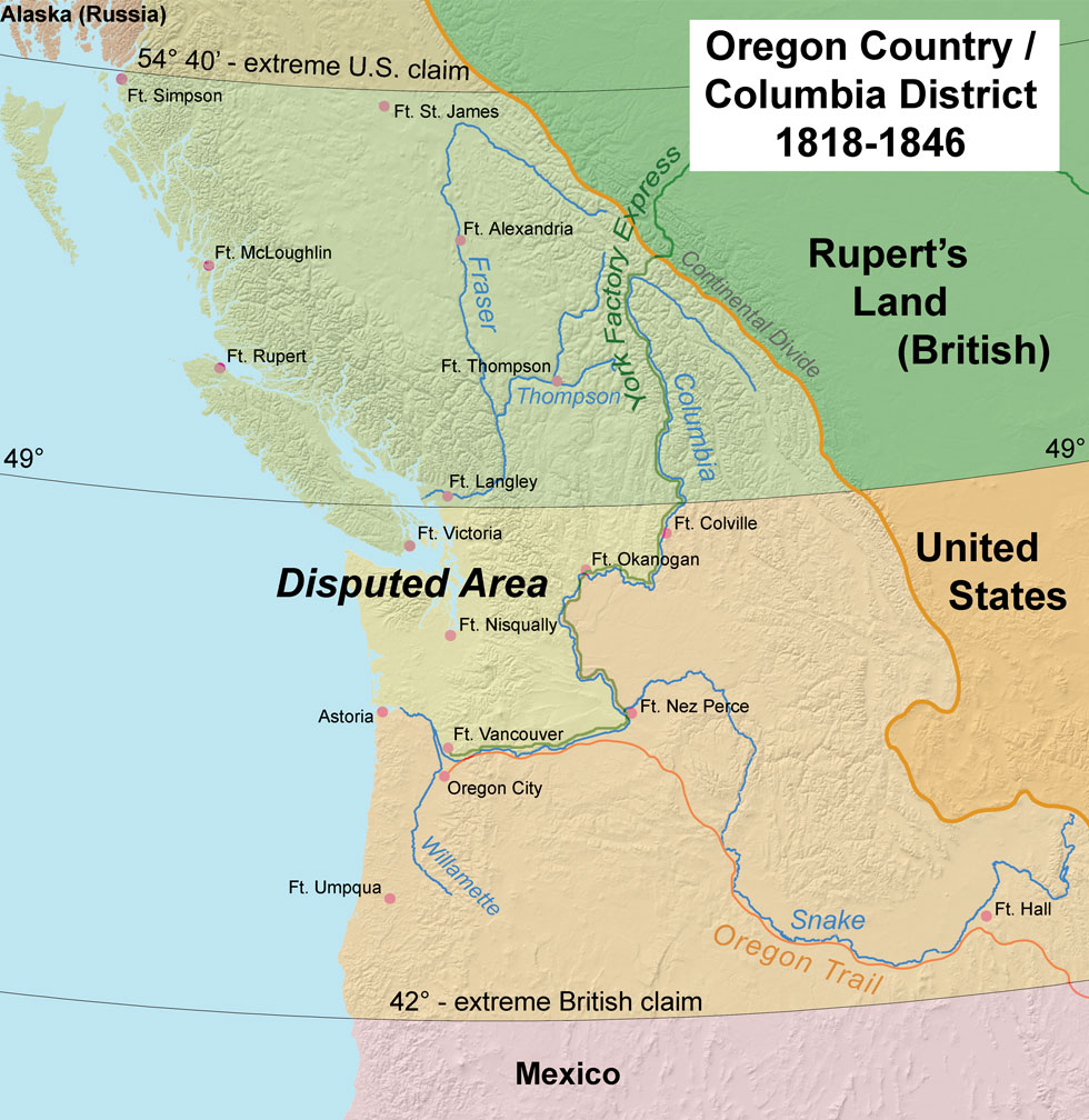В 1818 году США и Британия договорились о совместном владении этой территорией — без чёткой границы. Но дальше началась чехарда: американские поселенцы массово ехали по Oregon Trail и заселяли регион; США хотели продвинуть границу как можно севернее; Британия (через Hudson’s Bay Company) имела здесь коммерческий интерес.