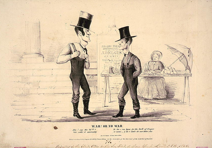 Речь идёт об Орегонском вопросе (Oregon Question) — споре между США и Великобританией за огромную территорию на северо-западе Северной Америки в первой половине XIX века. Спорная территория включала: современный Орегон, Вашингтон, Айдахо, часть Монтаны, и юг нынешней Британской Колумбии.
