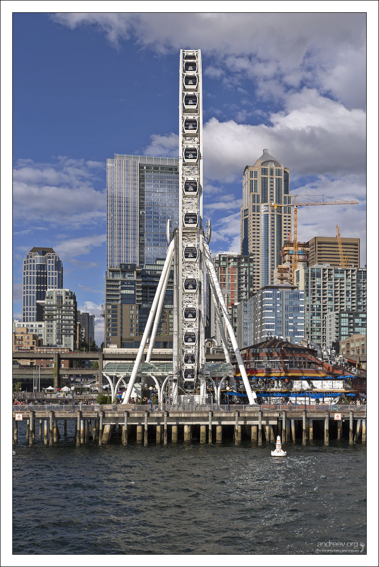 Залив Эллиотт, озеро Юнион и залив Пьюджет-Саунд блестят на солнце. Популярное колесо обозрения The Seattle Great Wheel вращается на набережной.